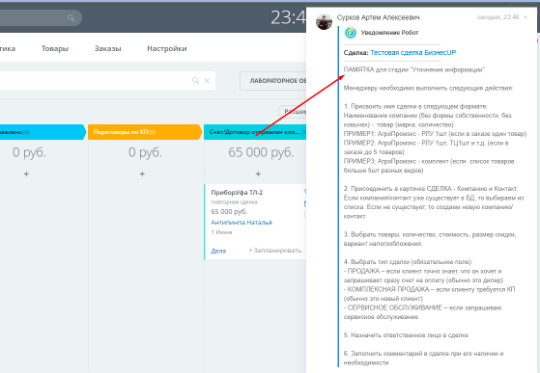 Аналогично предыдущей стадии, при переходе сделки на стадию "КП отправлено"- система присылает менеджеру уведомление с памяткой о действиях на данном этапе.